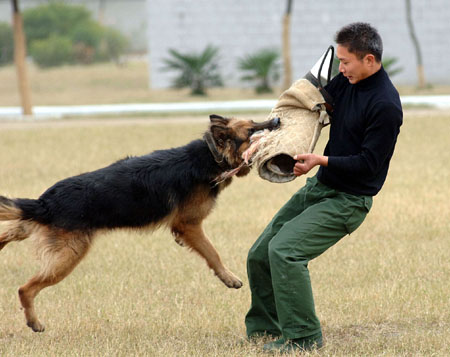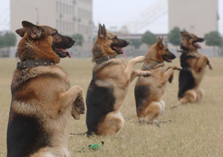 policemen and two police dogs at a military base in Hefei, East China's Anhui