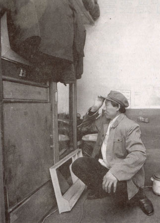 Li Guangqi, who plays Mao Zedong, adjusts his cap before a performance.