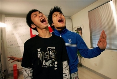 Huang Yixin, left, and Wei Wei, right, former college roommates from south China who last year found worldwide web notoriety with their low-quality, high-hilarity lipsynching clips, perform one of their famous numbers during a recording session in Beijing, China Tuesday, Dec. 12, 2006. Their mock music videos draw millions of Internet viewers and thousands of fawning reviews by fans who declare them hilarious, talented, cute, and hot. They posted their first 'performance,' a 4.5 minute clip of lipsynching to the Backstreet Boys hit 'I Want It That Way,' to their college intranet in March 2005. It quickly migrated to big sites like YouTube and Google Video and fast became one of the most watched and highest rated amateur clips online.[AP] |