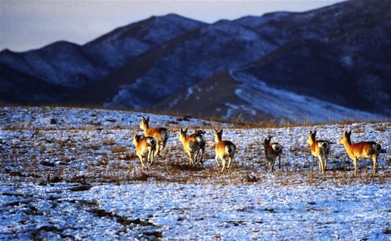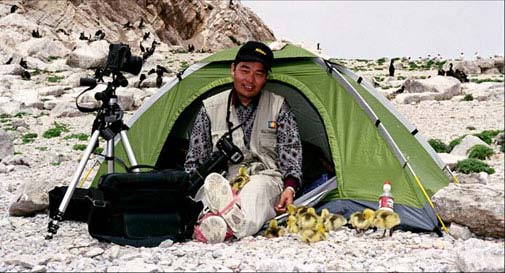 "My view of photography is a combination of 30 percent o passion, 30 percent reason, 30 percent perseverance and ten percent indifference to fame or gain," said Ge. Now he has a collection of over 30,000 pictures that covered each kind of bird there. As a well-known environmental protection activist, he focuses his attention on the protection of China's only endemic antelope, the Procapra Przewalskii, at Qinghai Lake, China's largest inland saltwater lake in the northwestern province of Qinghai. Procapra Przewalskii, named after Russian naturalist Przewalskii, is a very attractive variety of highland antelope. "In November 1997, I took pictures of seven antelopes as they were running and became the first to capture this animal with a camera in Qinghai Province," said Ge. In the following years, he continued to study and photograph them, and exchanged ideas with experts from universities and research institutes, such as the Chinese Academy of Forestry. He said "based upon my ten year- track record, I found that the animal had to compete with domesticated goats and sometimes they were forced to live in the deep desert, where the wide wolves are a large threat."