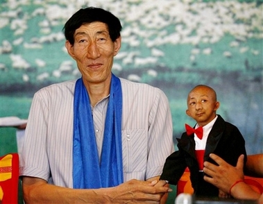 The world's tallest man, Bao Xishun, who stands 2.36 meters (7 feet and 9 inches), shakes hands with He Pingping, who only measures 73 centimeters (2 feet and 5 inches),in Baotou, China's Inner Mongolia Autonomous Region Friday, July 13, 2007. Nineteen-year-old He is applying for the Guinness World Record as the world's shortest man. [AP]