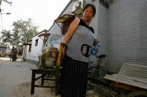 Updated: 2007-09-17 14:38 ![]() A woman surnamed Jin carries a chair with her pet monkey, as she moves her belongings out of her old home in a hutong in central Beijing to make way for renovations of the traditional residential compound. [The Beijing News]