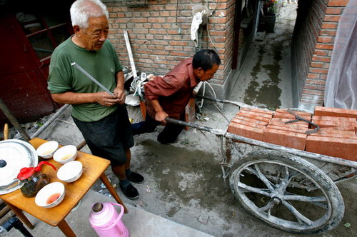 An old resident surnamed Ji looks as a laborer transports bricks for renovations of a