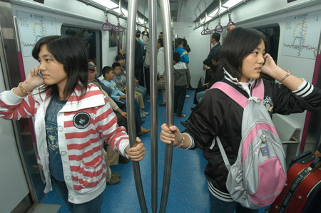Updated: 2007-10-11 15:16 ![]() Passengers make phone calls while riding the new subway Line 5 in Beijing, October 7, 2007. The 27.6 km (16.5 miles) tube is shallower than the earlier lines, meaning passengers should never lose their mobile phone signal. [The Beijing News]