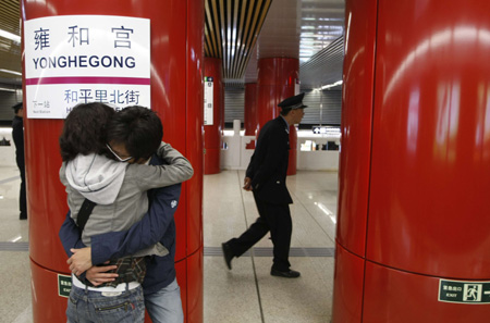 Updated: 2007-10-11 15:16 ![]() A couple hugs as a policeman walked past them inside a station of the new subway Line 5 in Beijing October 7, 2007. Beijing opened the new metro, aimed at improving the city's transport system. [Agencies]