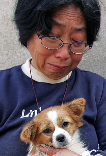 Holding an adopted dog, Fang Jiangxue grieves over missing her mother's funeral looking after these dogs. [newsphoto]