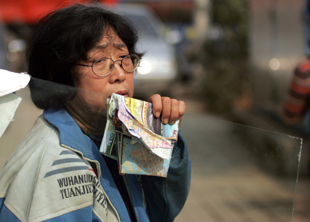 Fang carries a piece of glass she bought to install in the window of her rented house. [newsphoto]