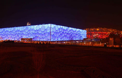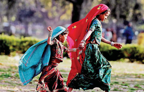 Two girls run in a street of Delhi on Feb 25. Photos by Wang Jing / China Daily |