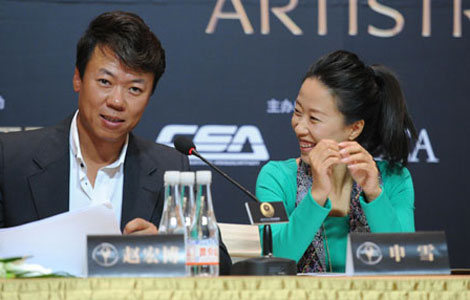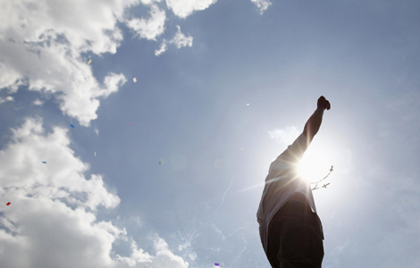 China's Yong Zhou (R) and co-pilot France's Pascal Maimon pose in their Great Wall car while holding a Chinese flag on the podium during the departure ceremony of the fifth South American edition of the Dakar Rally 2013 in Lima Jan 5, 2013.[Photo/Agencies]