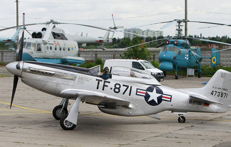An American P-51D 'Mustang' fighter arrives at the Aviation Museum in Zhulyany airport in Kiev July 1, 2013. A July 2-4 festival of vintage planes in the Aviation Museum at the Zhulyany airport in Kiev will feature 27 aircraft, including visiting aircraft -- WWll Soviet fighter Yakovlev 3, American P-51D 'Mustang' fighter and Tiger Moth training aircraft of the British Royal Air Force.[Photo/Agencies]