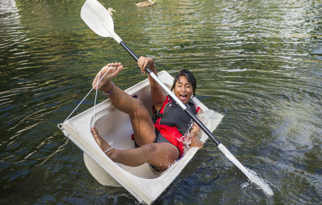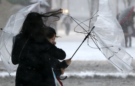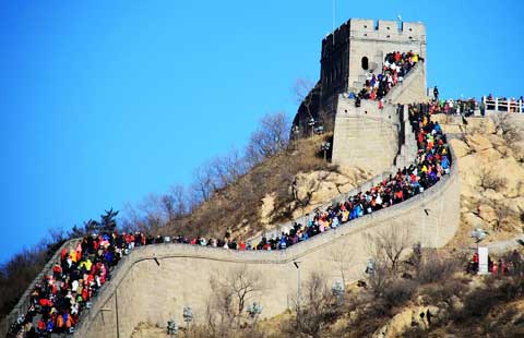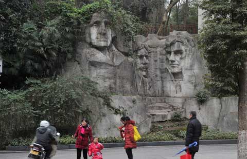 More than a dozen wild pigs jump off a 3-meter platform and swim under the instruction of a trainer at a performance in a park in Guangzhou, Guangdong province, on Saturday. It takes three months for the trainers to teach them how to dive and swim. [Photo by Gao Dianhua/Asianewsphoto]