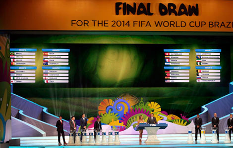 The groups for the 2014 World Cup finals are shown on the screen after the draw was made at the Costa do Sauipe resort in Sao Joao da Mata, Bahia state, December 6, 2013. The 2014 World Cup finals will be held in Brazil from June 12 through July 13. [Photo/Agencies]