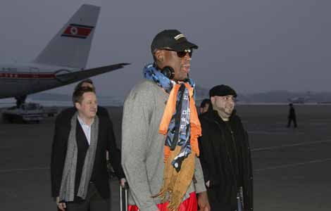 Former NBA basketball star Dennis Rodman takes a jump shot as he gives a training demonstration to North Korean basketball players in Pyongyang, North Korea on Friday, Dec 20, 2013. Rodman selected the members of the North Korean team who will play in Pyongyang against visiting NBA stars on Jan 8, 2014, the birthday of North Korean leader Kim Jong Un. [Photo/icpress]
