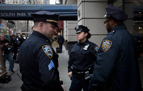 Police stand outside the South Park Tower rental apartment in Manhattan, New York Dec 22, 2013. The New York Police Department says a man and a child have died after plummeting from the midtown Manhattan building, local media reported. The bodies of the 35-year-old man and the 3-year-old boy were found on the rooftops of separate buildings on 59th Street behind the South Park Tower rental apartment building from which they plummeted, media cited police. [Photo/Agencies]