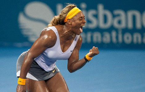 Serena Williams of the US hits a return during her women's singles semifinals match against Maria Sharapova of Russia at Brisbane International tennis tournament in Brisbane, Australia, Jan. 3, 2014. Serena Williams won 2-0. [Photo/Xinhua]