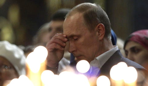 Russia's President Vladimir Putin attends the Orthodox Christmas service at the Holy Face of Christ the Savior Church in the Russian southern city of Sochi, Jan 7, 2014. Most Orthodox Christians celebrate Christmas according to the Julian calendar on January 7, two weeks after most western Christian churches that abide by the Gregorian calendar. [Photo/Agencies]
