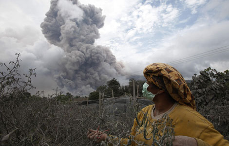 A villager looks backwards as he rides a motorcycle during a Mount Sinabung eruption at Beras Tepu village in Karo district, Indonesia's North Sumatra province, January 15, 2014. More than 25,000 villagers have been evacuated since authorities raised the alert status for the volcano to the highest level in November 2013, local media reported on Monday.[Photo/Agencies] |