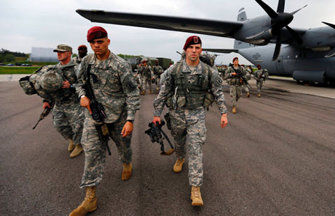 Supporters of Egypt's army and police gather at Tahrir square in Cairo, on the third anniversary of Egypt's uprising, Jan 25, 2014. Twenty-nine people were killed during anti-government marches on Saturday while thousands rallied in support of the army-led authorities, underlining Egypt's volatile political fissures three years after the fall of autocrat president Hosni Mubarak. Security forces lobbed teargas and some fired automatic weapons in the air to try to prevent demonstrators opposed to the government reaching Tahrir Square, the symbolic heart of the 2011 uprising that toppled the former air force commander. [Photo/Agencies] |