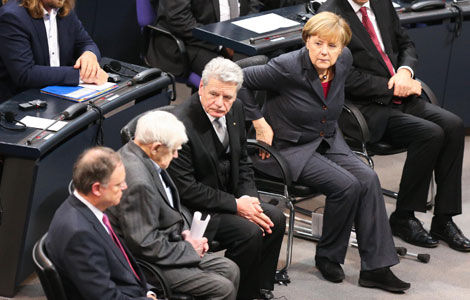 Palestinian brides sit on stage during a mass wedding ceremony in the West Bank city of Jericho Jan 28, 2014. A spokesman working together with the Palestinian Presidential Office said some 300 Palestinian couples, 80 of them from the Gaza Strip, wed on Tuesday in the mass ceremony funded by the Presidential Office and attended by President Mahmoud Abbas. Each couple would also be given $4,000, the spokesman said. [Photo/Agencies]