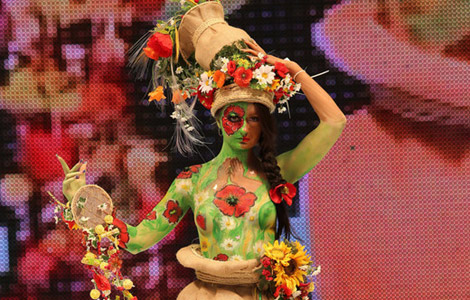 A model strikes a pose during a body painting competition in Saint Petersburg, Russia, Feb 22, 2014. [Photo/icpress.cn]