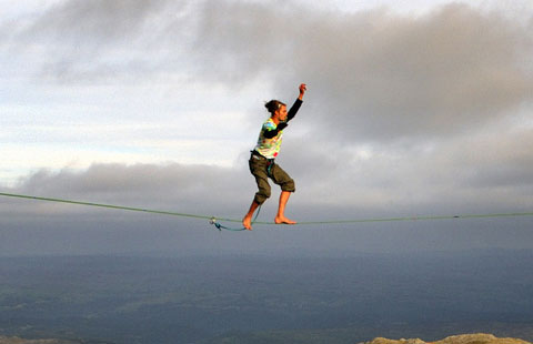 The Moscow-based photographer undertakes his daredevil feats without a harness or safety net, but with a friend, who takes his picture.