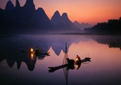 A feature of the journey is watching out for the 'cormorant fishermen'. Rafts are made of five large bamboo poles lashed together and slightly upturned at either end. Two men steer the craft with long poles. A circular basket holds the catch. The 'fisherman' is actually a bird: a black cormorant with a ring around its neck to prevent it swallowing the fish. The cormorants dive, catch a fish in their beaks and bring it back to the boat. This sight is most scenic at night when lanterns, used to attract the fish, are suspended from the rafts.
