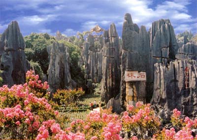 Editor's recommendation: Shilin Park April 6: Today we flew into Kunming. The flight took about 3.5 hrs and I thought it was a bit bumpy. Kunming is one of the most beautiful cities I have ever seen - it looks like a miniature Shanghai, with upscale shopping and unique street food, but crammed in to a much smaller area. Apparently you can drive through the whole city in 15 minutes, although it has a population of 4 million people! It's late now, so more tomorrow. April 7: What a gorgeous day. The weather was some of the nicest I've seen in a long, long time - it was winter when I left the States, and I've been dealing with Beijing weather ever since. Today we had class in an interesting little glass café place in a park - it was set in a garden, so the view was quite pleasant, and we had couches to sit on; the place was decorated with giant stuffed teddy bears. We also learned about proper tea etiquette: you are supposed to lift your tea glass up a little bit as the person is pouring it, and the pourer is supposed to make sure everyone's cup stays full. We formed an age-based rotation to decide who pours. After class, I took a stroll out in the park. It was beautiful - stone courtyards separated small bodies of water, which the town fills and empties artificially - I noticed a pumphouse museum where some of the equipment was housed for the pumping. The walkways featured many different gardens, pavilions, and flowers, and smelled wonderful. I sat in the sun for a half hour just enjoying the view. I wonder how many tourists visit that park - I got many more looks from people than I normally do in Beijing or Shanghai. People walking through would stare at me as they passed by. I don't blend in in China at all - my blond hair gives me away as a foreigner immediately. Most of the people in the park looked like residents of Kunming; some were clearly Han tourists, probably from towns like Beijing and Shanghai. One old man, whom I took for a local, stared at me for a minute or two. He wore a little fisherman's style cap, and a bright blue suit, with green shoes and red socks. He had a cane and smoked a long pipe. Another old man walked by wearing a white, broad brimmed hat decorated with flowers, similar to the Easter bonnets little girls wear to church on Easter Sunday in the United States. One little girl walked up to me and said loudly, "Hello!" She must have known I was an English speaker and wanted to practice. Her mother laughed at her when I responded with an equally enthusiastic "Hello!"