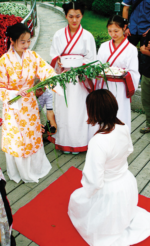 This undated photo shows a group of young people in traditional Han-style clothes honouring the tradition of Duanwujie, or Dragon Boat Festival. June 19 marked this year's Duanwujie, or Dragon Boat Festival, one of the most important traditional festivals in China, following the Mid-autumn Festival and the Spring Festival. But how many people still feel the spirit of the day? A community in Shanghai last week planned to host a Dragon Boat Festival folk culture contest, inviting young people to learn how to make festival food zongzi and fragrant bags, a traditional accessory for the festival. To the organizers' surprise, only 10 young people agreed to take part. Many others turned down the invitation, saying that they were too busy to come. Among those who felt depressed about the current state of the festival celebration were elders. Ms. Zhang is a retired worker from Shanghai. To celebrate the festival, Ms. Zhang and her husband prepared delicious food for their daughter and son-in-law, hoping they could return home for the festival. However, the young couple simply told their parents that they didn't have time to do so. Ms. Zhang fears that it will never happen again - this scene of the whole family sitting together, wrapping zongzi and enjoying their festival dishes. Many young people gave their own explanation for this behavior. Ms. Cao is a white collar worker living in Shanghai. As for the folk culture contests, she says that she was not in such activities. Though she recognises that it is traditional to make Zongzi and wear fragrant bags, she didn’t think it absolutely necessary to do so, since people can buy these goods at any places. Ms. Huang, a middle school teacher, argues that the traditional festivals have been made almost "edible" by businesspeople. Zongzi, moon cakes, they're all affected the same way: The more cultural content it is assumed to have, the higher the price it fetches. Mr. Gong, a civil servant, also agrees that the booming economy is keeping the traditions away from us. People now become more accustomed to the fast-food style of life, losing the patience to savour the nutrience of tradition. |
