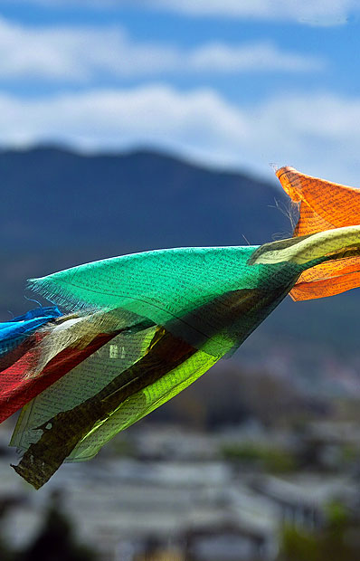 Wind-Horse FlagUpdated: 2007-07-24 08:38 **Color Five colors are usually employed on prayer flags - white, yellow, red, green and blue. It is sung in folk songs: " yellow flags are the symbol of the lotus flower; red ones signal timely wind and rain; blue ones represent thriving and prosperous descendants; Red ones on grass land looks like antlers, shining like dazzling sunlight while burning vigorously like a fireball on top of a roof." In the eyes of the Tibetans, white is the color of purity and kindness; red means prosperity and toughness; green shows serenity and gentleness; yellow indicates mercy and talent while blue reveals intelligence and bravery. **StyleThe style of wind horse flags varies a lot in different areas. In Tibet, flags are made from small pieces of cloth and are hung on a thin rope, quite like the small colorful flags in Beijing that welcome foreign heads of state. The Tibetans also like to draw a line of wind horse flags between two mountaintops or over the spacious streets of Lhasa. In areas where the militant Kangba people live, the prayer flags look a little like the combat flags of ancient times. A mast with strips of cloth hanging from it is placed in the mountains. Sometimes, such masts can be seen over an area of about 600 square meters, and when looked at from a distance, resemble the red broomcorn plant. Another type of prayer flag is made in the shape of a tower, with a piece of