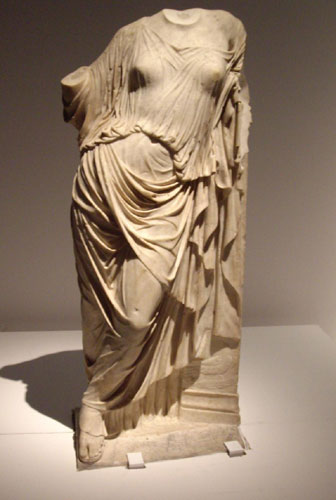 Statue of Aphrodite (head missing) with her himation draping loosely off the left shoulder.