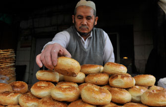 A vender at Erdaoqiao, Urumqi was putting freshly baked small oil nangs on display to attract customers. [Photo by Han Liang/For China Daily] |