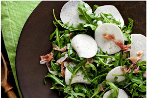Recipe for shaved turnip salad with arugula and prosciutto.