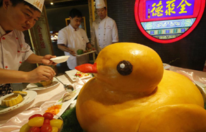 A yellow duck made from flour and pumpkin on display on Sunday at a Beijing Quanjude Roast Duck restaurant, a chain famous for its Peking duck.