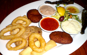 Grilled meat on skewers, various vegetarian dips with soft, warm flat bread, and small cups of very strong coffee.