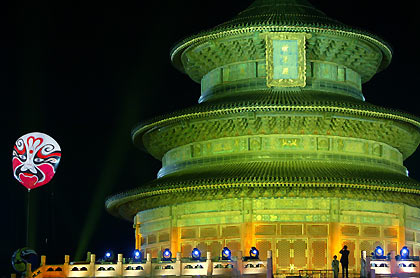 A Chinese opera mask is displayed during "Beijing's Night" ceremony for the Fortune Global Forum in Beijing May 17, 2005. [Reuters]