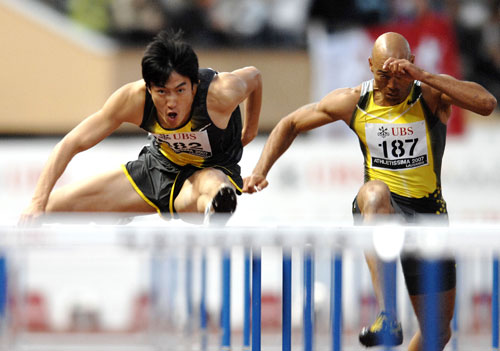 Liu Xiang of China competes in the men's 110 metre race at the IAAF Super Grand Prix athletics meeting in Lausanne July 10, 2007. Liu Xiang won the event in 13.01 seconds. [Xinhua]