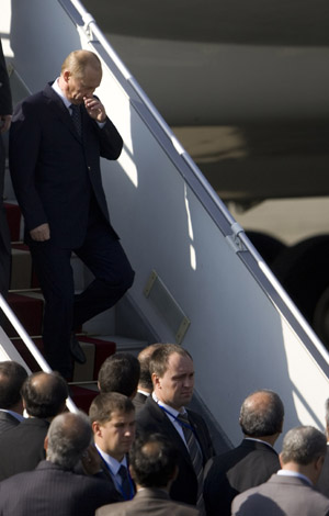 Russia's President Vladimir Putin descends the stairs of an airplane in Mehrabad International airport, as he arrives to attend the Caspian Sea Littoral States summit in Tehran October 16, 2007. [Agencies]
