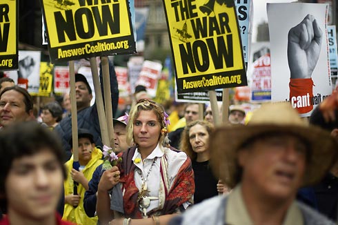 Protesters hold signs and march against the war in Iraq, the Bush administration and potential war in Iran during a peace rally in New York October 27, 2007. Protesters planned to march through the city. [Agencies]