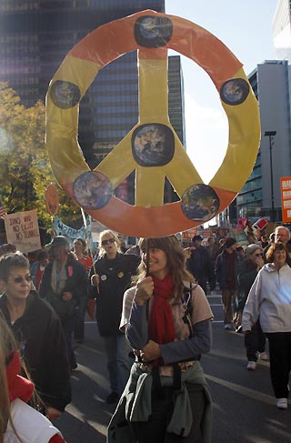 Kerry Blouin of Ann Arbor, Michigan, marches with thousands of anti-war protesters through the streets of Chicago, en route to a rally at Chicago's Federal Plaza October 27, 2007. [Agencies]