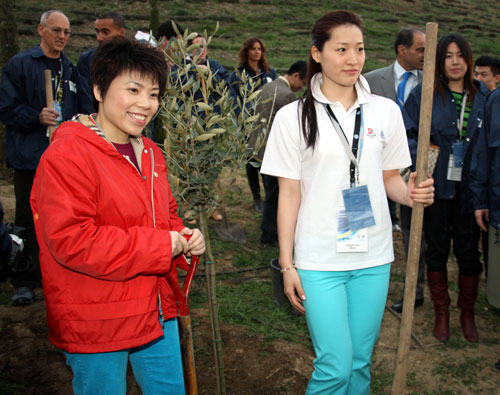 China's Olympic champions and Beijing Olympic Games torchbearers, table tennis player Deng Yaping (L) and swimmer Luo Xuejuan participate in a tree-planting activity in front of the tomb of Pierre de Coubertin, the chief founder of the modern Olympics Games in ancient Olympia, Greece March 23, 2008. The ceremony will be officially held at 11 o' clock a.m. on Monday local time. [Xinhua]