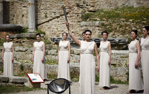 Maria Nafpliotou (front), the High Priestess of the Flame-lighting Ceremony in Ancient Olympia upholds the Olympic flame at a rehearsal before the Lighting Ceremony for the Beijing Olympic Games in ancient Olympia, Greece March 22, 2008. The ceremony will be officially held at 11 o' clock a.m. on Monday local time. [Xinhua]