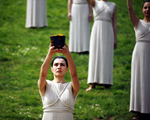Maria Nafpliotou, the High Priestess of the Flame-lighting Ceremony in Ancient Olympia carries the Olympic flame at a rehearsal before the Lighting Ceremony for the Beijing Olympic Games in ancient Olympia, Greece March 22, 2008. The ceremony will be officially held at 11 o' clock a.m. on Monday local time. [Xinhua]