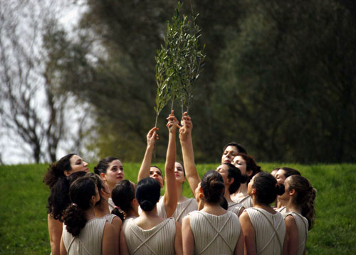 Priestesses perform with olive branches at a rehearsal before the Lighting Ceremony for the Beijing Olympic Games in ancient Olympia, Greece March 22, 2008. The ceremony will be officially held at 11 o' clock a.m. on Monday local time. [Xinhua]