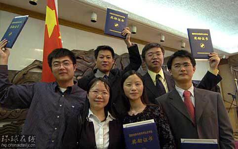 環球在線消息:5月5日,(前排左起)沈寓實、李倫、巫俏冰、李升東、(后排左起)段剛和邢毅共6位2005年度“中國國家優秀自費留學生獎學金”獲得者在中國駐美國洛杉磯總領事館合影。當天,中國駐洛杉磯總領事館向6位就讀美國加利福尼亞州不同高校的中國博士研究生頒發2005年度“中國國家優秀自費留學生獎學金”。國家優秀自費留學生獎學金于2003年設立,獎勵對象為在國外攻讀博士學位、年齡40歲以下的優秀自費留學生,所學專業包括自然科學和人文社會科學。