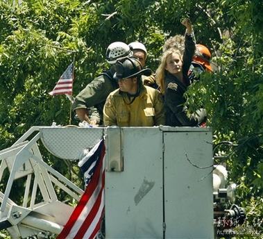 在樹上示威的達里爾·漢娜向支持者揮手致意。(美聯社)