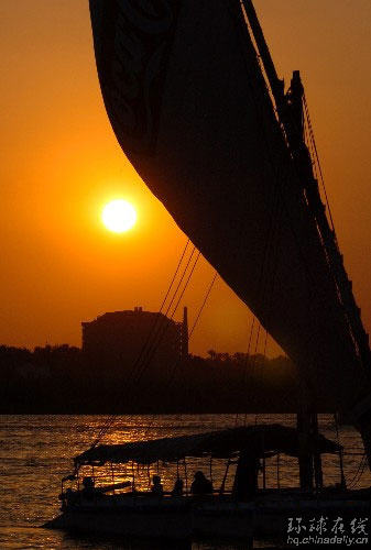 這是2006年6月10日,一艘帆船在夕陽下的尼羅河上行駛。