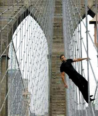 據(jù)悉,他將僅用雙手把自己懸吊在紐約市標(biāo)志性建筑布魯克林大橋距離水面41米高的鋼索上,并將只憑借雙臂,在空中“完成一系列高難度驚險(xiǎn)動(dòng)作”!