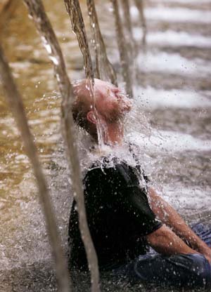 在波士頓,一名男子在噴泉下享受片刻清涼