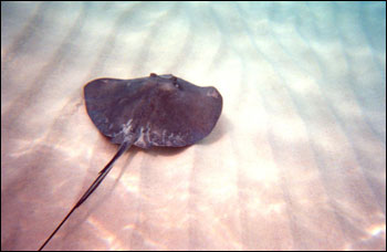 刺鰩長著一根長長的尾巴,上面有兩排毒刺。平時它多靜臥在泥沙里,一旦人在岸邊赤腳踩著它,它就會掄起長鞭似的尾巴一掃,毒液立刻順著刺尖進入人體,輕者傷口疼痛并伴有心慌,重者可能導致死亡。