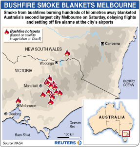 政府官員擔(dān)心未來(lái)幾天被大火吞噬林地的面積可能達(dá)到60萬(wàn)公頃,即使近期控制住火勢(shì),要徹底撲滅這些大火可能需要數(shù)月時(shí)間。維多利亞州12月份的溫度創(chuàng)下了50年來(lái)的最高紀(jì)錄,達(dá)到了42攝氏度。大風(fēng)、高溫再加上持續(xù)的嚴(yán)重干旱給消防工作造成了極大困難。